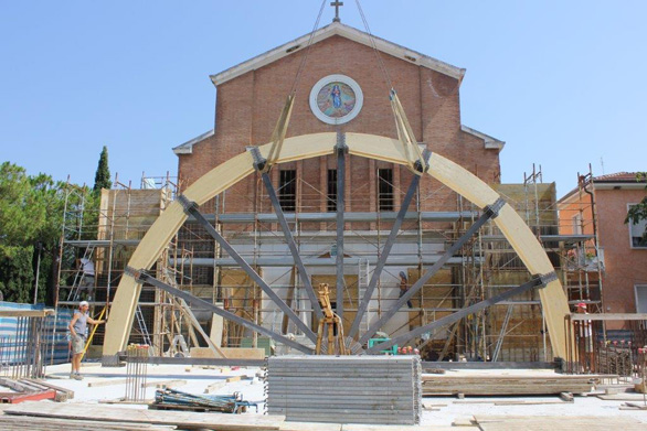 La Chiesa comincia a prendere forma Questa la “centina” che permetterà la realizzazione dei quattro archi previsti per l’ampliamento della Chiesa.